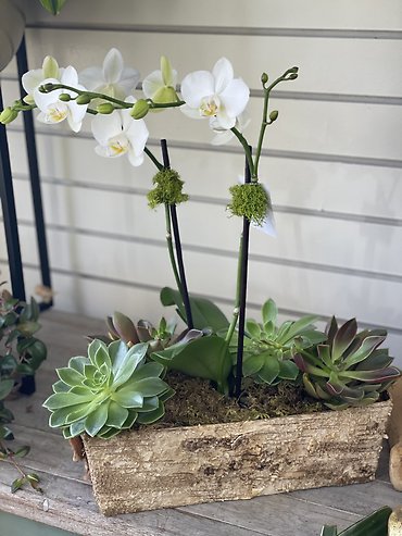 This orchid planter consists of a two-spike white mini Phalaenopsis orchid plant accented with succulents in an oblong container.